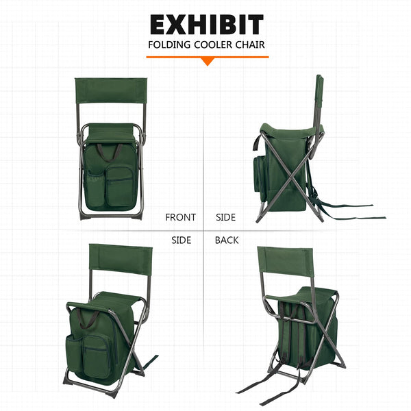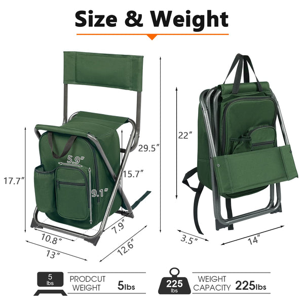 Details: PORTAL Cooler Seat Camping Chair, Compact Portable Folding Stool with Backrest for Fishing, Picnic, Hiking ▶ This camping chair with cooler allows you to sit almost anywhere you want and is compact and easy to carry! ▶ Bags under seat can hold drinks, food, water bottles and accessories separately in designated compartments. ▶ Insulated cooler below chair holds 12 cans. 2-way zippers of cooler bag provide easy access to a cold drink. ▶ Innovative 2 in 1 design lets you switch between using it as a bag and as a chair. ▶ The compact folding chair with cooler is made of 600D polyester and a durable metal frame. ▶ Chair folds flat for easy storage, and features a carry strap for easy travel. SPECIFICATIONS : Overall dimensions: 13" L x 13" W x 29.5" H Folded dimensions: 14"*22"*3.5" Cooler bag dimensions: 10.8" L x 7.9" W x 15.7" H Weight capacity: 225lbs Weight: 4.85 lbs ABOUT PORTAL Portal Outdoors offers a wide range of camping and outdoor products from furniture to tents and air beds to sleeping bags. All products are selected and optimized by product experts in a modern and innovative way.