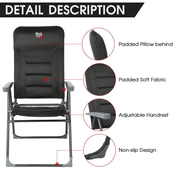 - HIGH BACK CAMPING CHAIR: The backrest of this folding chair is heightened to fit different figures.The back adjustable function helps to realize ideal angles wanted by groups of various heights. An excellent gift choice for most people, including tall friends