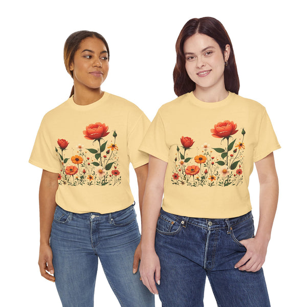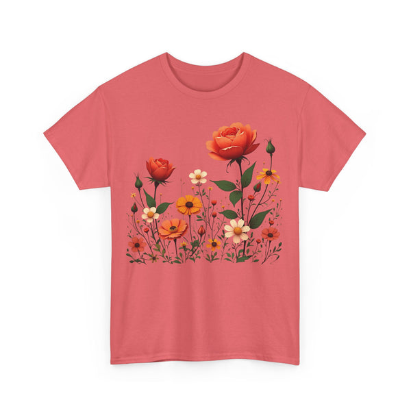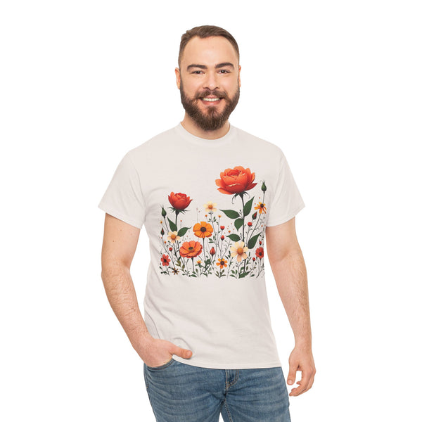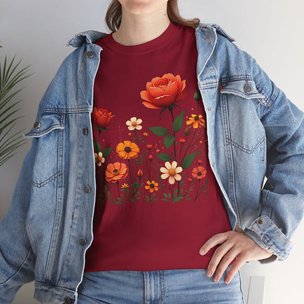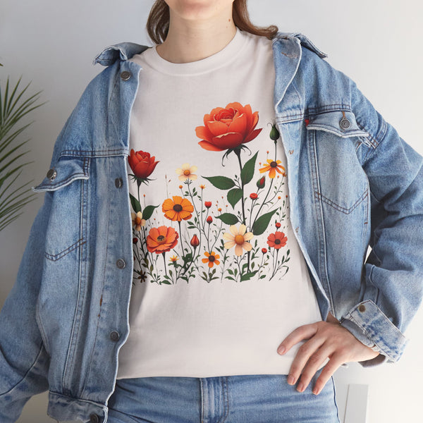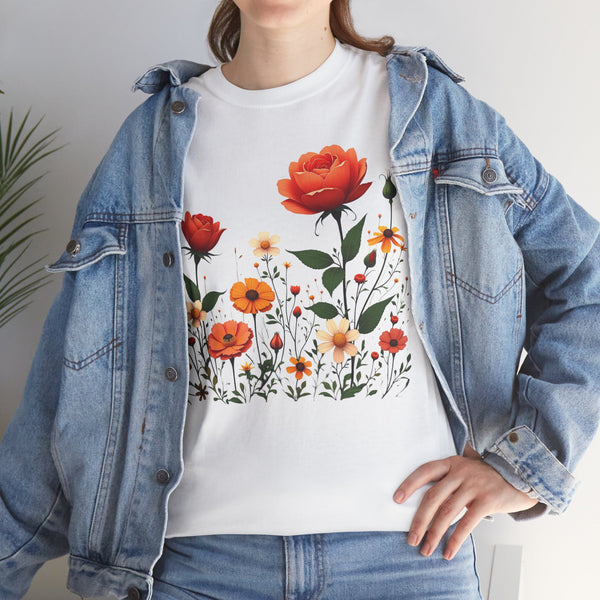 Perfect Fit: This shirt for women has a relaxed fit that flatters every woman. Therefore, no matter if you prefer jeans, skirts or shorts, you will look effortlessly stylish. Versatile Style: This floral shirt will elevate your look be it brunch, running a few errands or spending a casual day out. Ensure to clear a spot for this masterpiece in your wardrobe. The Wildflower and Orange Roses Graphic T Shirt for women allows you to connect with nature adding a bit of it to your daily outfits. Shop now from our collection of ladies graphic tees to get the perfect look!
