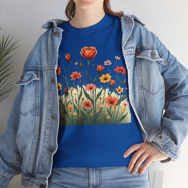 Perfect Fit: This shirt for women has a relaxed fit that flatters every woman. Therefore, no matter if you prefer jeans, skirts or shorts, you will look effortlessly stylish. Versatile Style: This floral shirt will elevate your look be it brunch, running a few errands or spending a casual day out. Ensure to clear a spot for this masterpiece in your wardrobe. The Wildflower and Orange Roses Graphic T Shirt for women allows you to connect with nature adding a bit of it to your daily outfits. Shop now from our collection of ladies graphic tees to get the perfect look!
