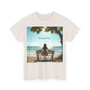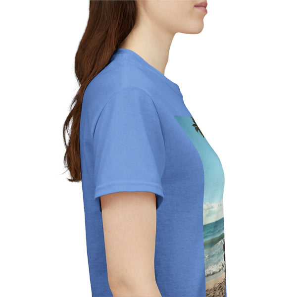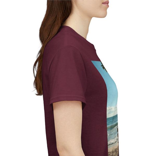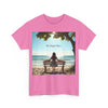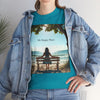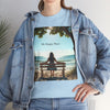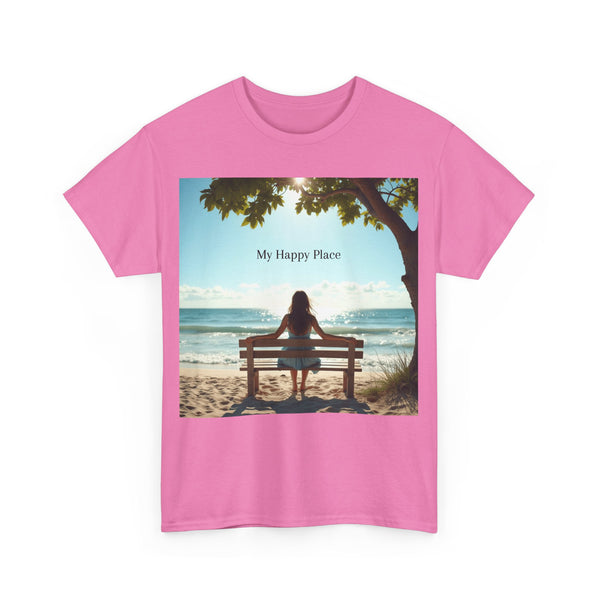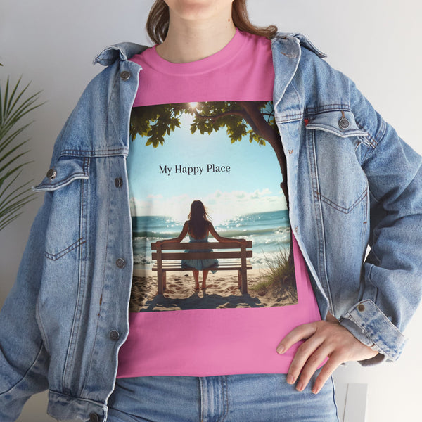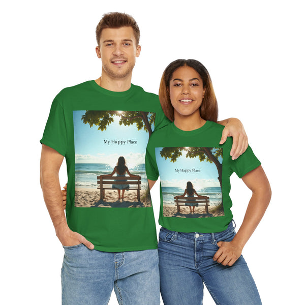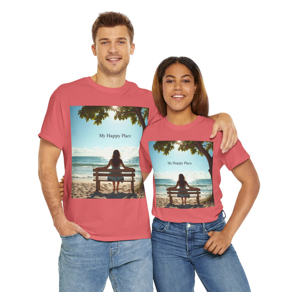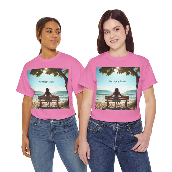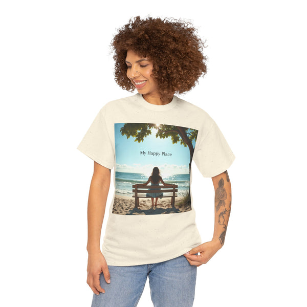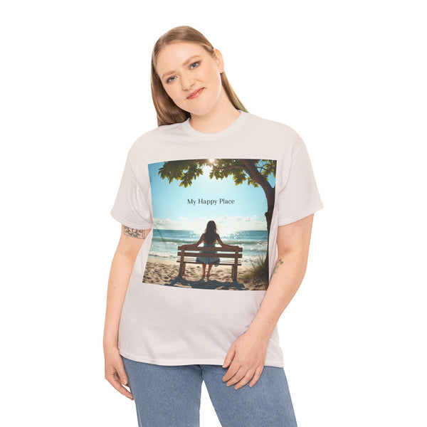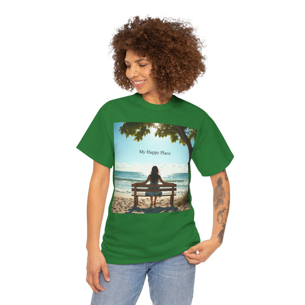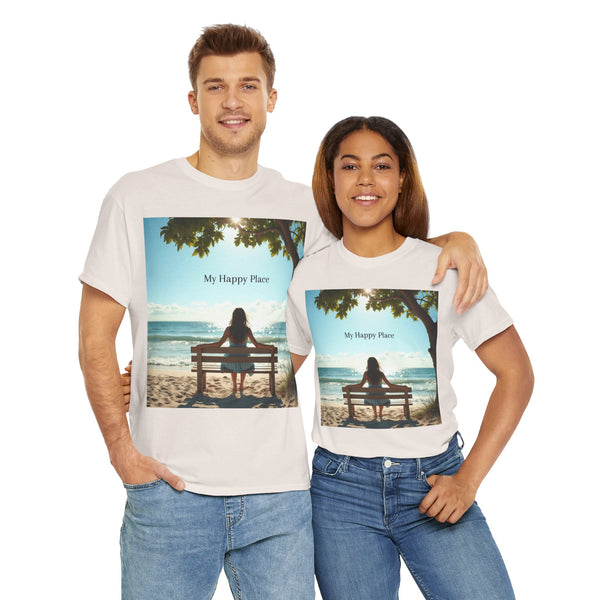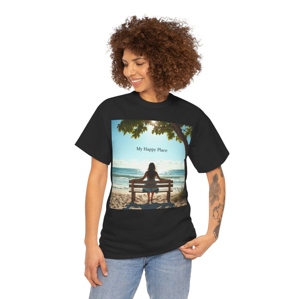 A classic fit T-shirt made from medium fabric, featuring an image of a woman sitting on a wood bench at the beach under a tree with the caption 'My Happy Place'. This design suggests the peaceful and tranquil setting of the beach with the waves crashing on the shoreline is the perfect place to find your perfect place of peace in a busy world. Perfect for adults looking for a comfortable and stylish tee with a meaningful message. Style #5003STS