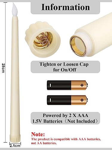 - Ideal Decorative Candles: each flickering flameless candle measures 0.8 x 11 inch, suitable for all standard and glass taper candlesticks, can be noticed easily, each LED candle need 2 AAA batteries (not included in package), easy to replace