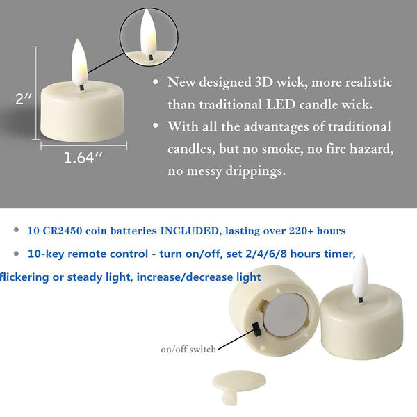10 Key Remote Control: The upgraded led tealights can be controlled by remote to turn on/off, keep tealights always on, set 2/4/6/8 timer, flickering/no flickering, adjust brightness, more convenient more smart life.