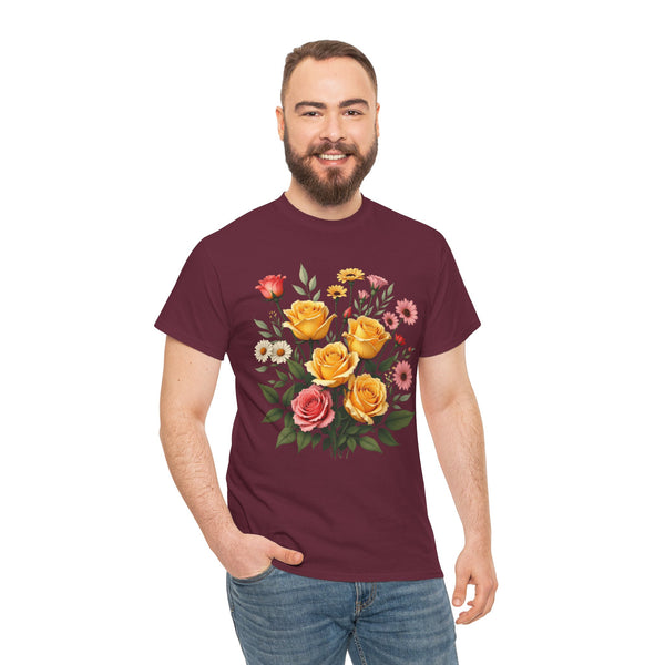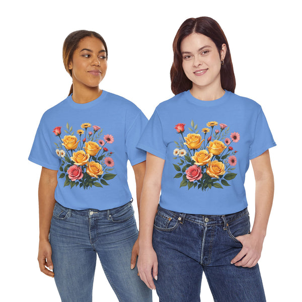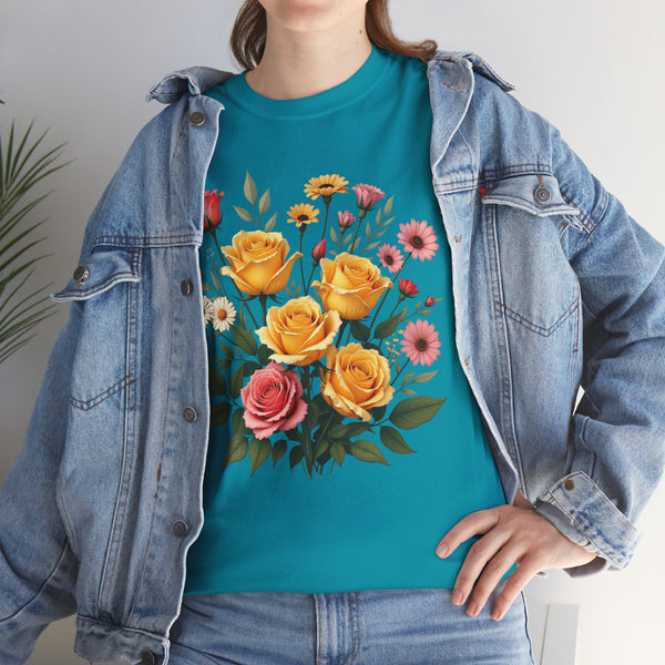 Perfect Fit: This shirt for women has a relaxed fit that flatters every woman. Therefore, no matter if you prefer jeans, skirts or shorts, you will look effortlessly stylish. Versatile Style: This floral shirt will elevate your look be it brunch, running a few errands or spending a casual day out. Ensure to clear a spot for this masterpiece in your wardrobe. The Wildflower and Pink/Yellow Roses Graphic T Shirt for women allows you to connect with nature adding a bit of it to your daily outfits. Shop now from our collection of ladies graphic tees to get the perfect look!