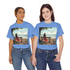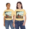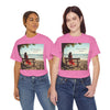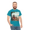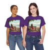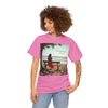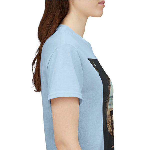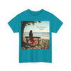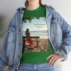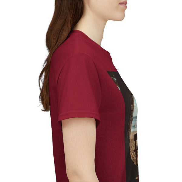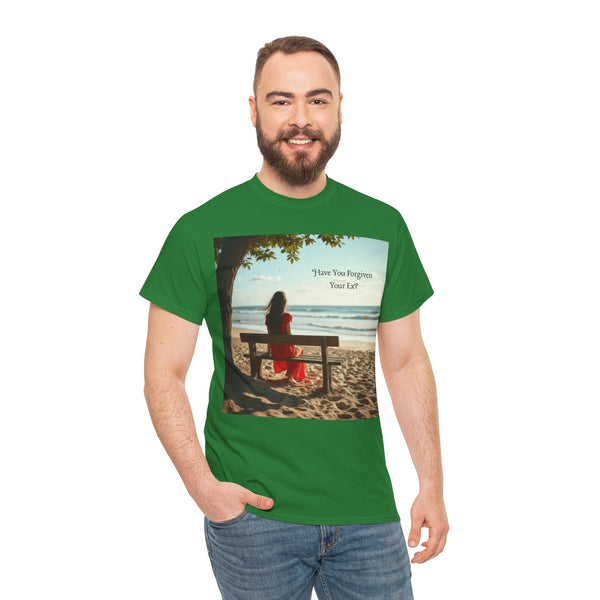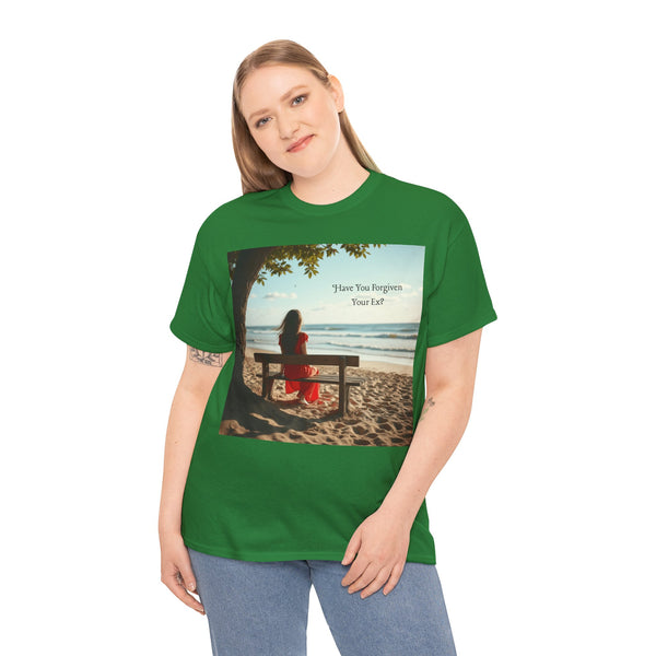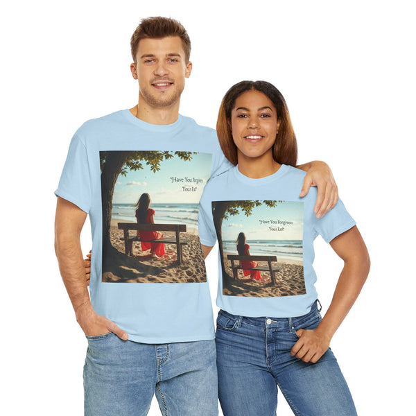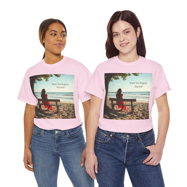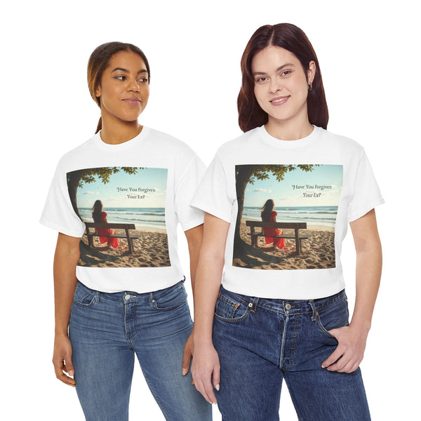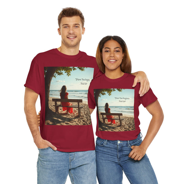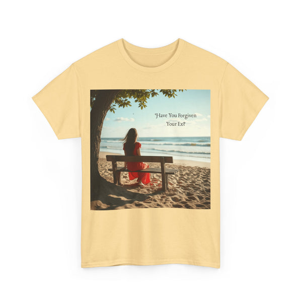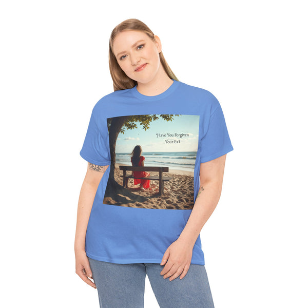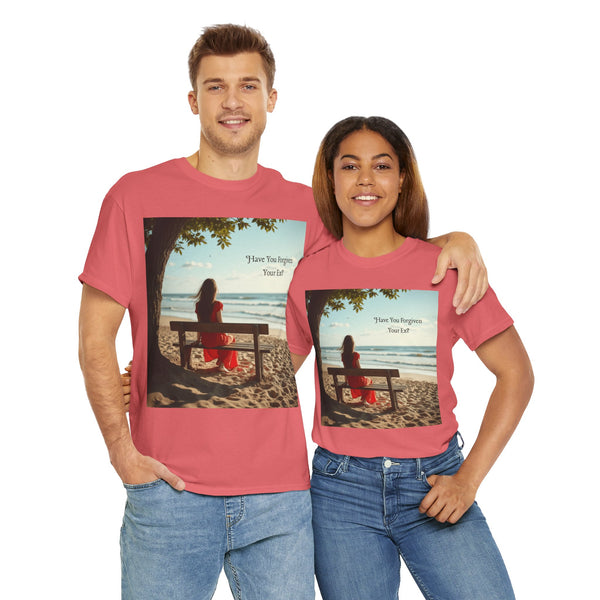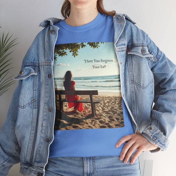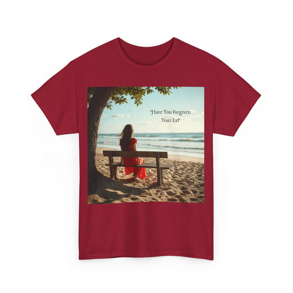 A classic fit T-shirt made from medium fabric, featuring an image of a woman in a red dress sitting on a wood bench at the beach under a tree with the caption 'Have you forgiven your Ex'. This design suggests forgiveness and moving on from past relationships. Perfect for adults looking for a comfortable and stylish tee with a meaningful message. Style #5002STS