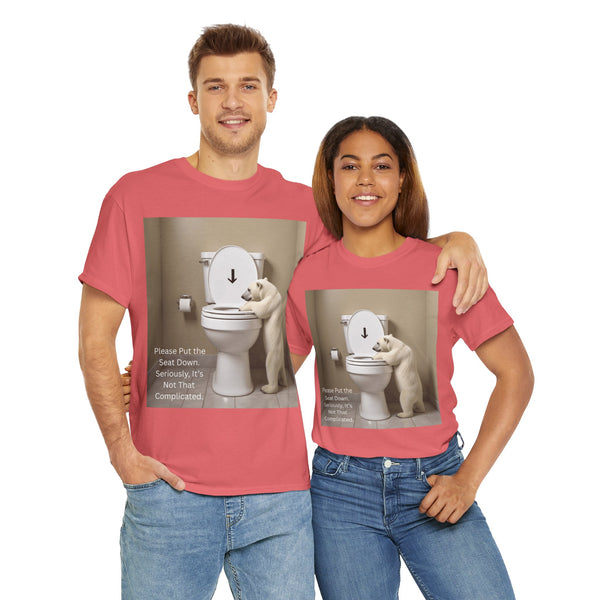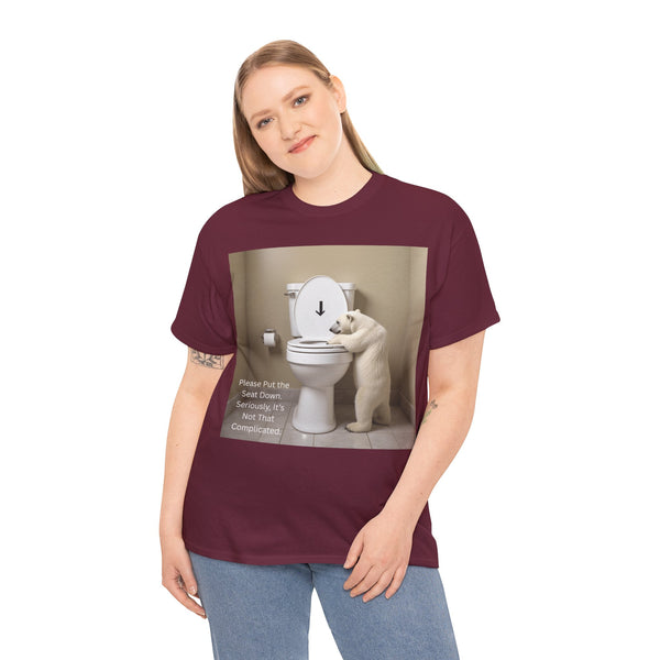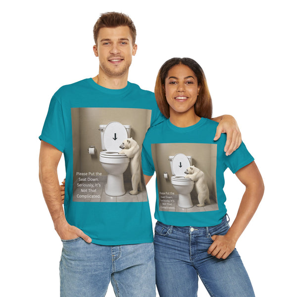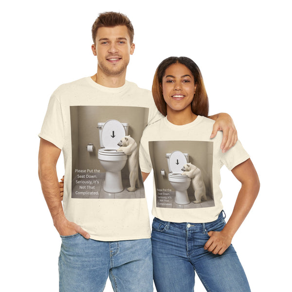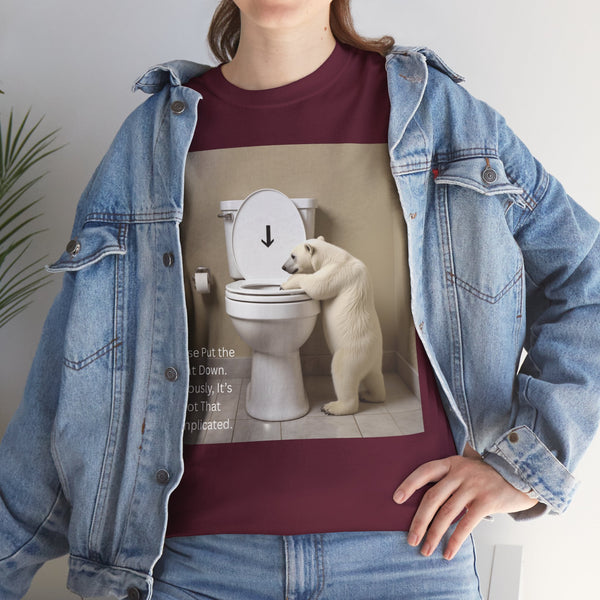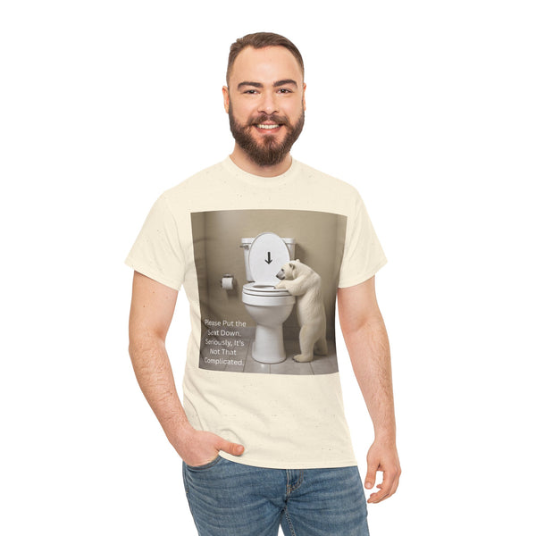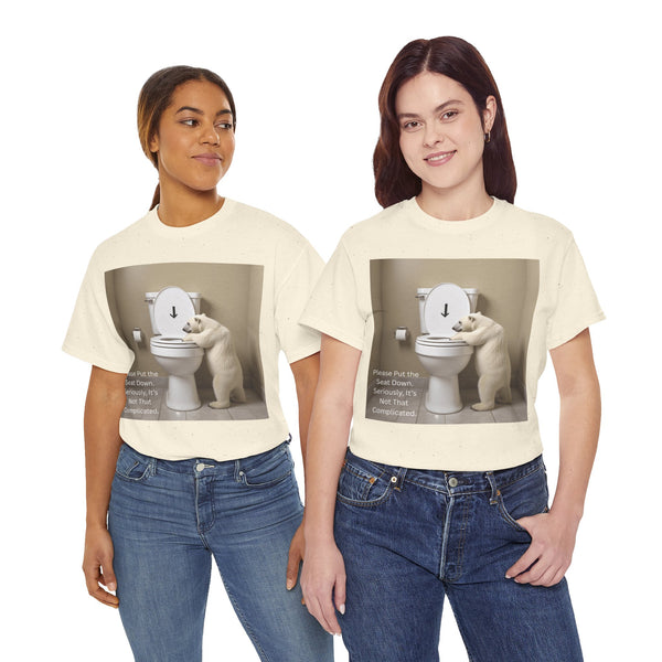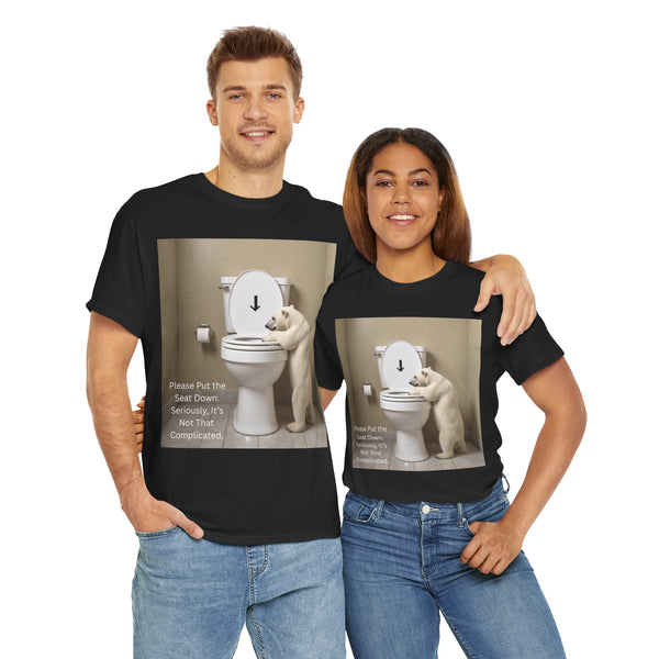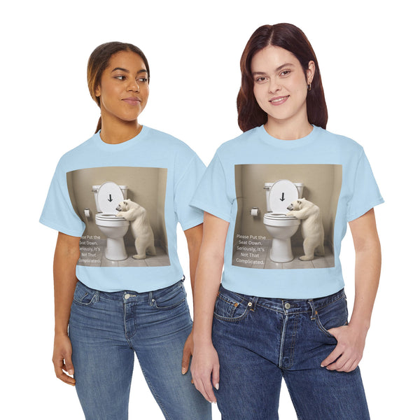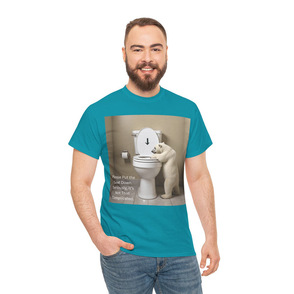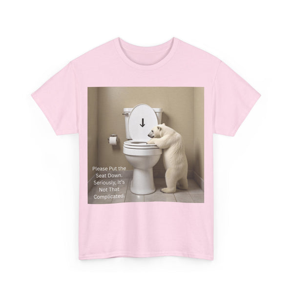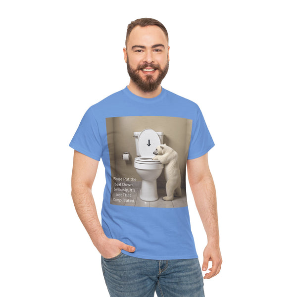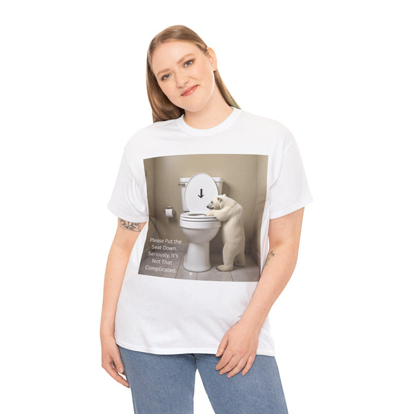 This Tee features a cute design of a small polar bear in a bathroom with a caption reminding to put the seat down. It gives a playful and humorous vibe, perfect for those who appreciate fun and light-hearted humor in their everyday clothing. Ideal for those who enjoy unique and quirky pieces, this Tee is great for gifting during birthdays or as a fun surprise for friends and family. Style #5004STS