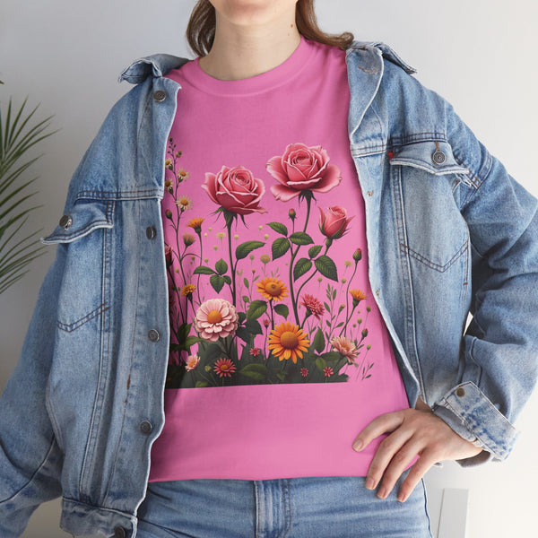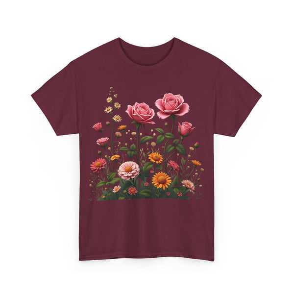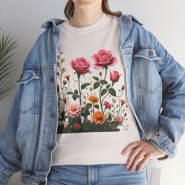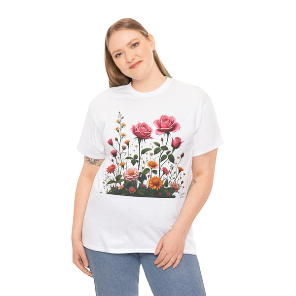 Perfect Fit: This shirt for women has a relaxed fit that flatters every woman. Therefore, no matter if you prefer jeans, skirts or shorts, you will look effortlessly stylish. Versatile Style: This floral shirt will elevate your look be it brunch, running a few errands or spending a casual day out. Ensure to clear a spot for this masterpiece in your wardrobe. The Wildflower and Pink Roses Graphic T Shirt for women allows you to connect with nature adding a bit of it to your daily outfits. Shop now from our collection of ladies graphic tees to get the perfect look!